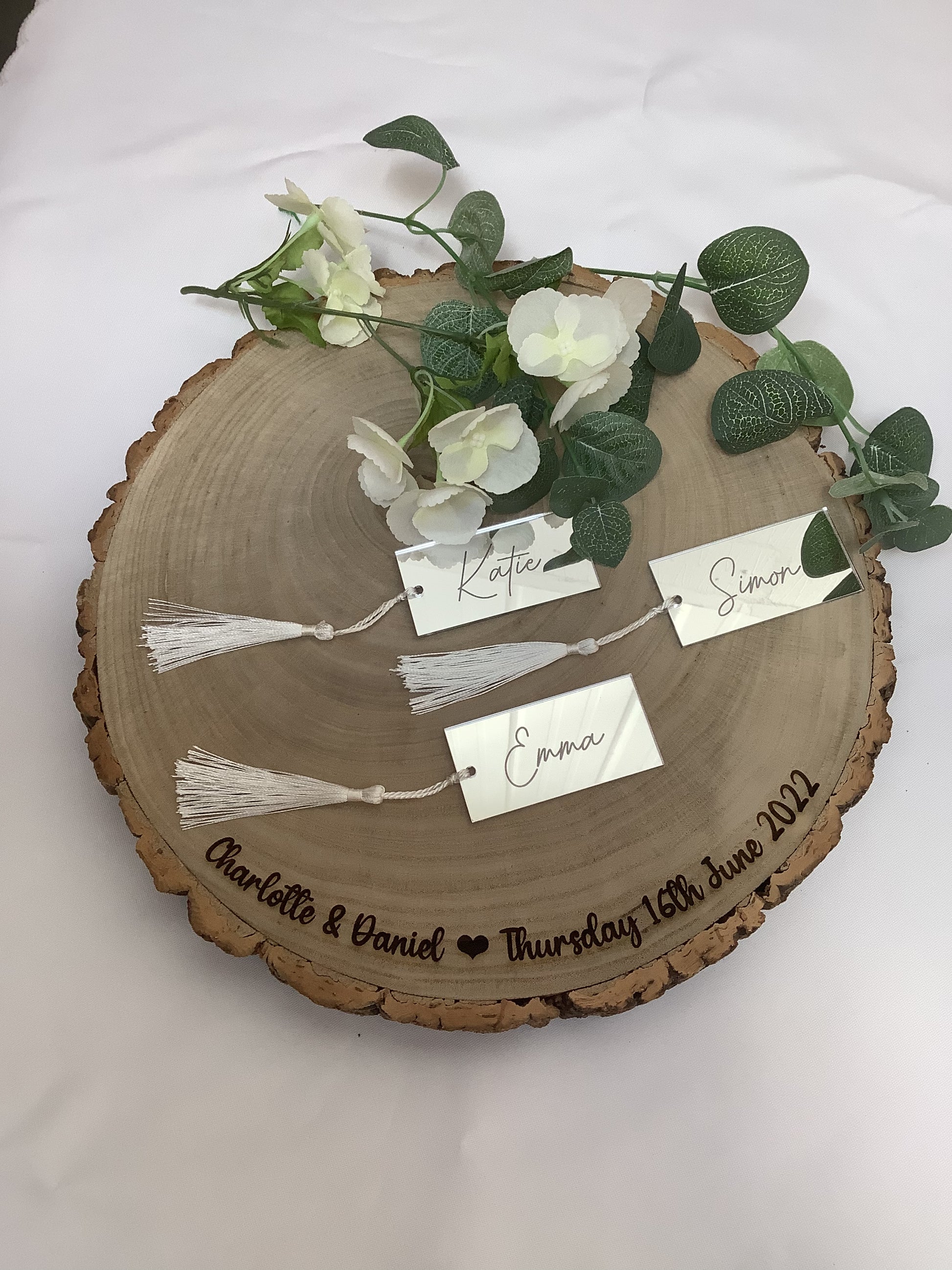 Elegant rectangle shaped mirrored place names with tassels.